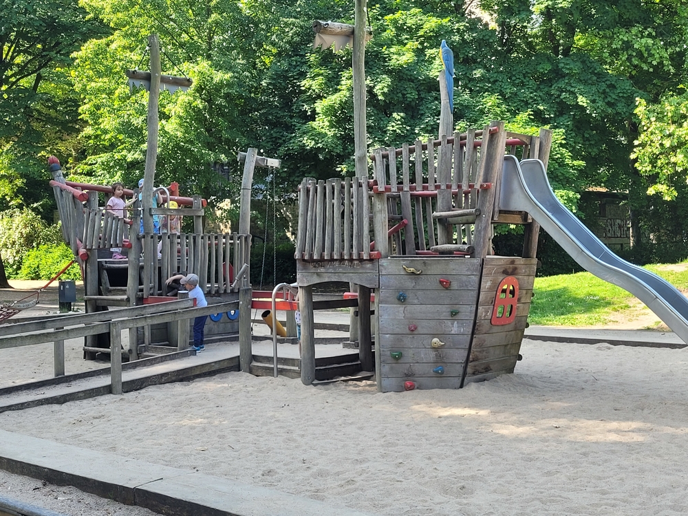 An einem sonnigen Tag im Juni hat sich die rote Gruppe des Kindergartens auf den Weg zum Spielplatz am Prinzenpark gemacht. Um dort hinzukommen, sind wir mit der Straßenbahn und mit dem Bus gefahren. Das hat sehr viel Spaß gemacht , denn ganz hinten im Bus wurden wir richtig durchgeschüttelt.