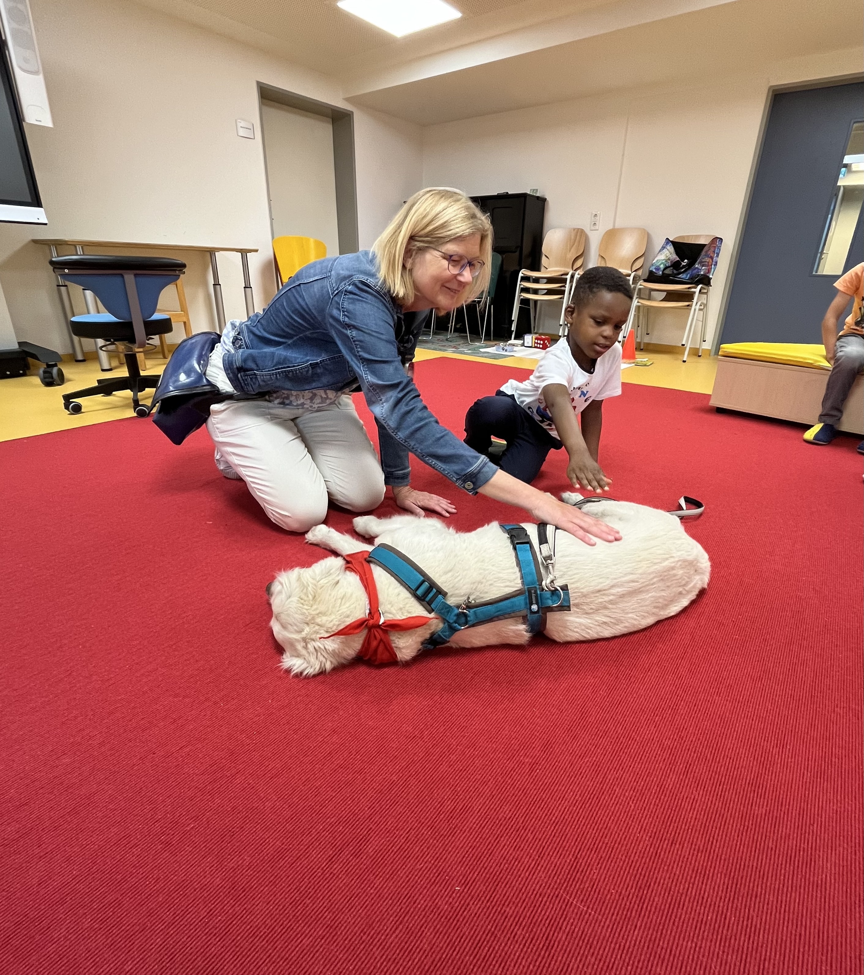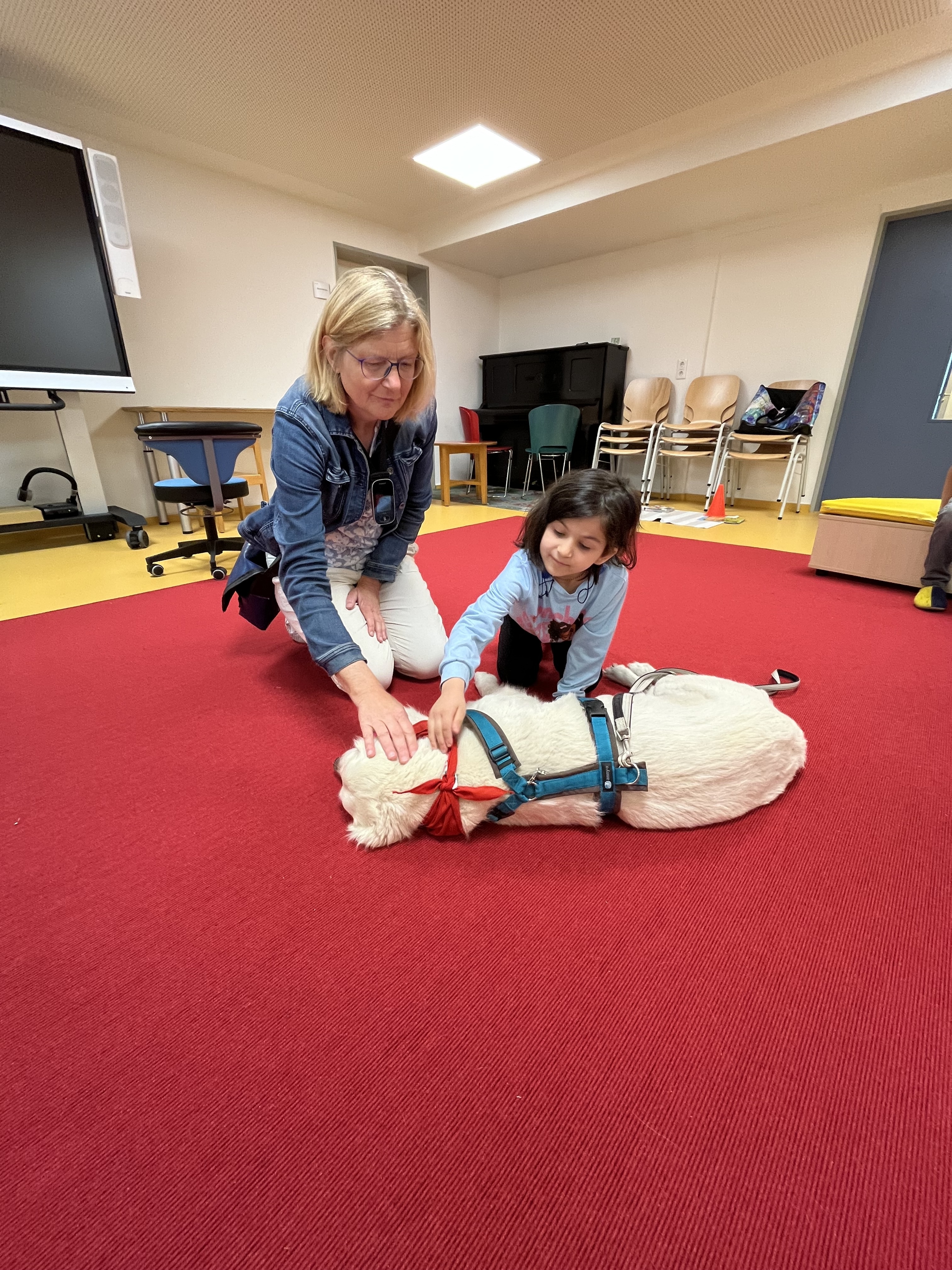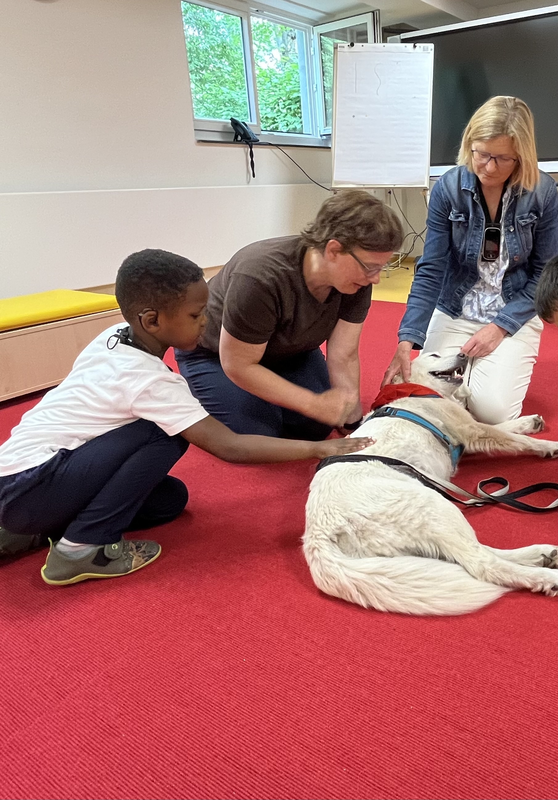 Am Montag, 10.6.2024 war es soweit. Die Vorschulkinder des Kindergartens LBZH bekamen Besuch: Frau Zense besuchte mit der Schulhündin Skylar zum ersten Mal den Kindergarten. Hund (Golden-Retriever-Mädchen) und Lehrerin wurden schon erwartet. In den Gruppen wurde der Hundebesuch mit den Kindern spielerisch vorbereitet. An der Leine erkundete Skylar den großen Raum und blieb sofort bei Nicole Baumann, der Leiterin unseres Kindergartens, sitzen. So konnte Frau Zense über ihre Hündin erzählen, viele tolle Fragen beantworten und Fotos zeigen. Dann ging es los: Skylar wollte gerne Leckerlies suchen, gestreichelt werden, würfeln, Kommandos erhalten. 45 Minuten - eine Schulstunde - ging schnell vorbei. Skylar will wiederkommen. Wie schön, dass einige der Vorschulkinder bei uns eingeschult werden. Skylar kennen sie dann schon.