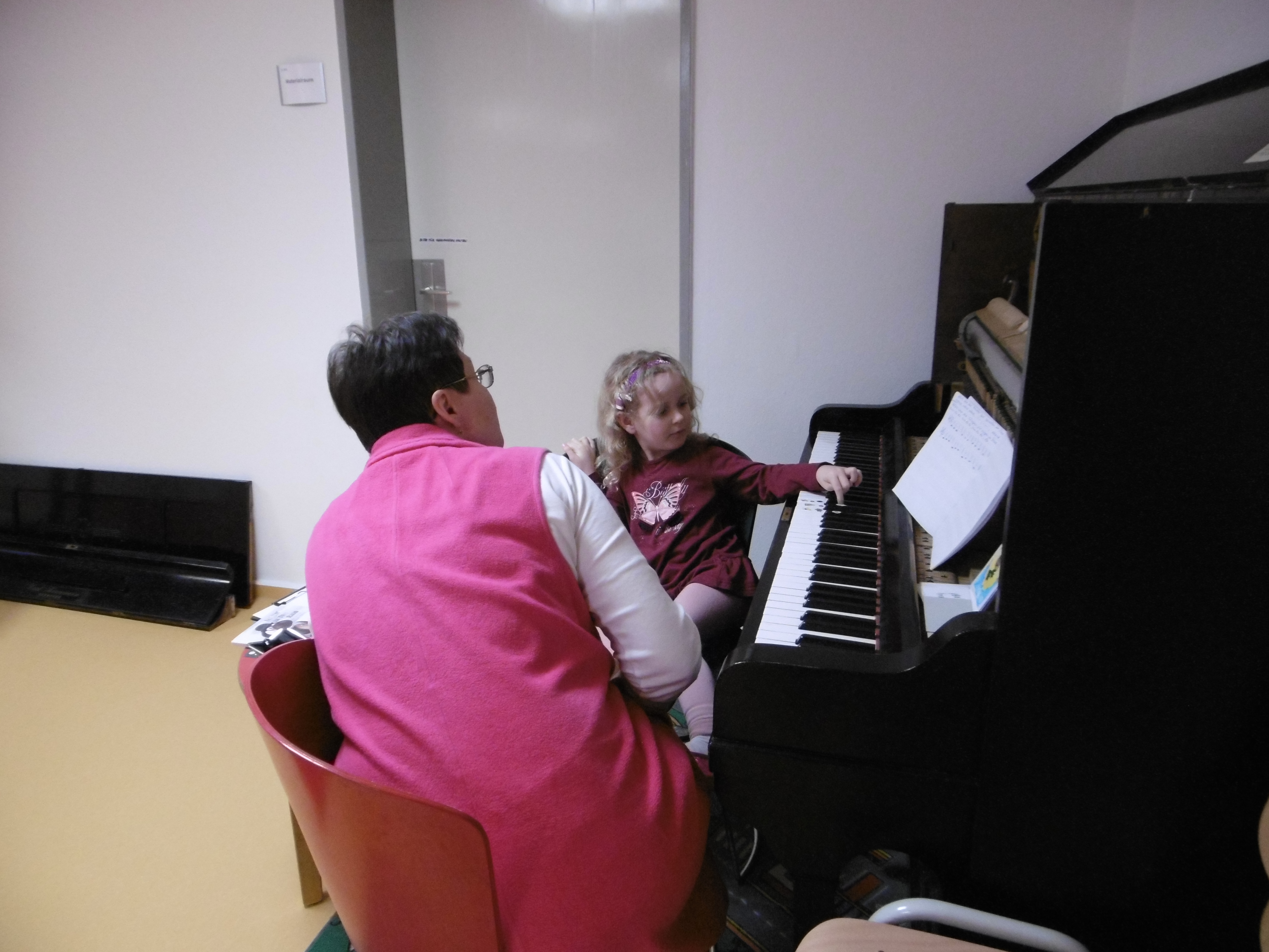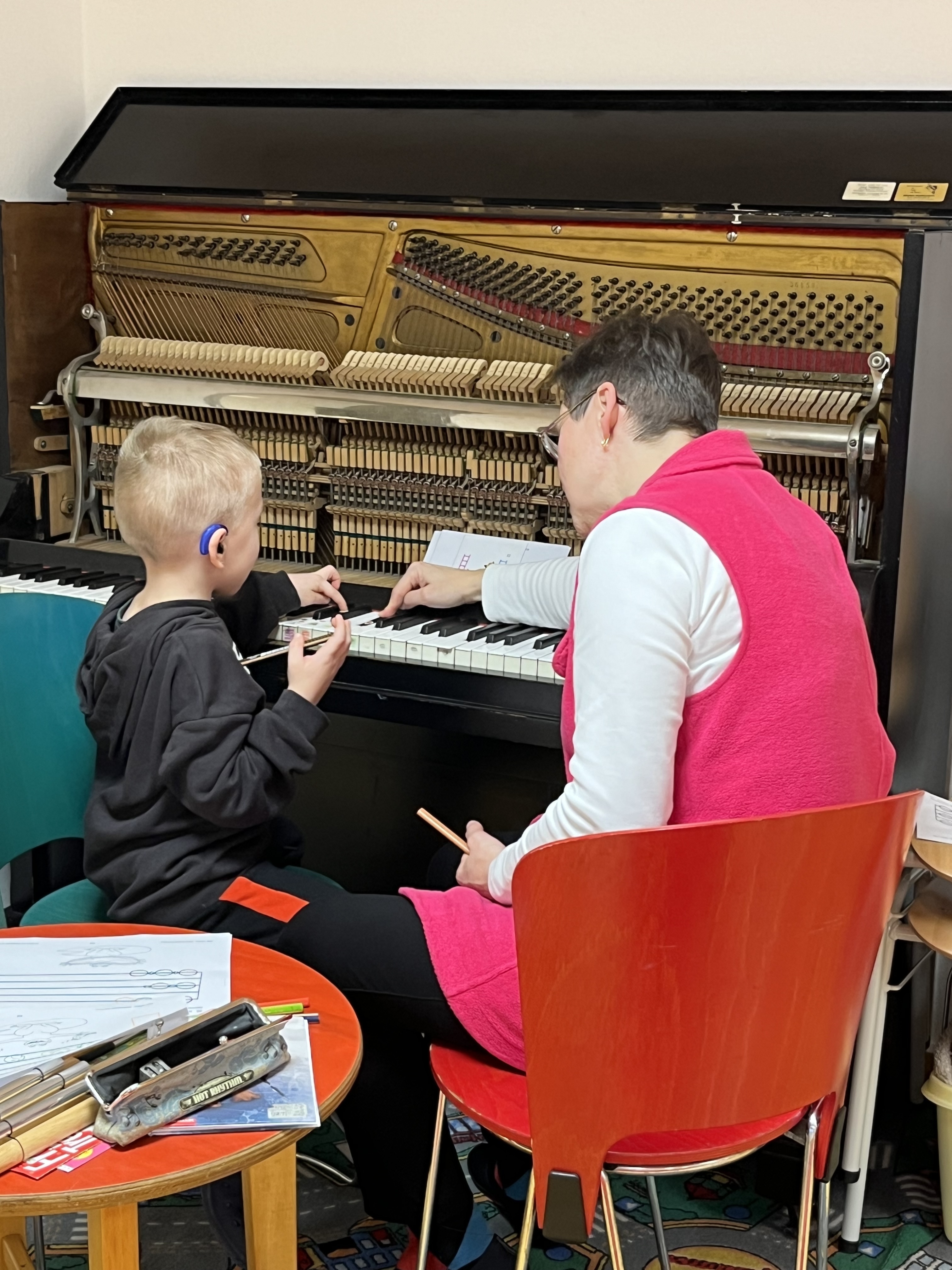 Jeden Dienstag können die Kinder mit vollem Körpereinsatz die Töne und Schwingungen mit all ihren Sinnen wahrnehmen. Bevor es losgeht, bereitet die Musikpädagogin das Klavier vor. Das Gehäuse des Klaviers wird für das Verstehen des Klanges geöffnet. Die Kinder können die Mechanik beobachten, was passiert, wenn sie eine Taste drücken. Dabei können sie mit der Hand die Saiten des Klaviers berühren, um die Vibration zu fühlen. Die Kinder nehmen sensibel wahr, wie die Vibration bei einem hohen oder tiefen Ton ist. Spielerisch wird vermittelt, dass der hohe Ton zum Beispiel wie ein Vogel klingt und der tiefe Ton wie ein brummender Bär. Dazu unterstützen Kuscheltiere die Klänge und den musikalischen Gesang.
