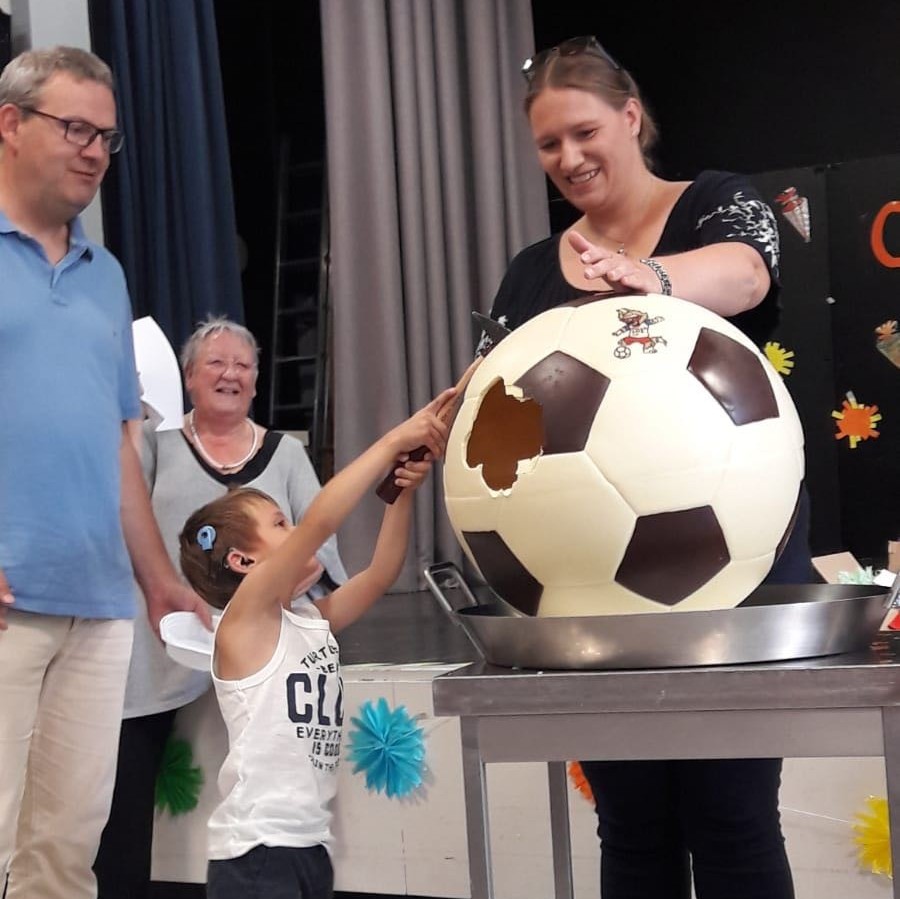 Der Sonderkindergarten Hören hat am 08.08.2018 eine Spende einer Confiserie aus Cremlingen erhalten. Neben einer Geldspende für den Förderverein wurden dem Kindergarten ein riesiger 9 Kg schwerer Schokoladenball und 30 Schokoladen- Fußball- Männer überreicht. Die Kinderaugen kamen aus dem Staunen nicht mehr heraus. Mit tatkräftiger Unterstützung der Schülerinnen und Schüler haben wir den riesigen Ball verspeisen können.