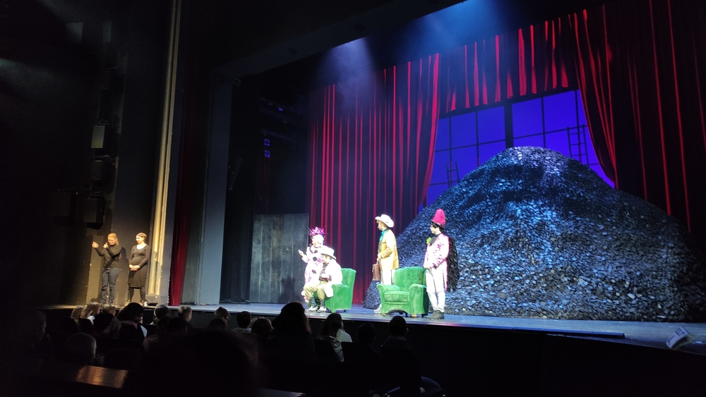 Schön war, dass wir immer wieder in das Stück mit eingebunden wurden – sei es mit Klatschen und Anfeuerungsrufen, mal als Zeugen für eine Lüge oder anderes. Witzig war der Barde aus dem Mittelalter, der uns mit kleinen Liedern erfreute. Auch Karl Marx und der Teufel hatten einen Kurzauftritt. Als der Teufel dann mit einem Knall und Feuer verschwunden war, hat sich manch einer erschreckt.