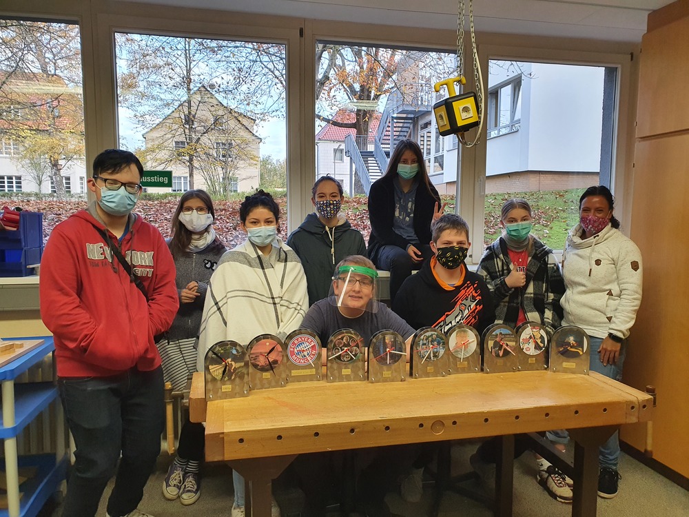 Hier präsentiert die Klasse 8.1 ihre Ergebnisse des BS-Modells "Metalltechnik". Die Uhren wurden in Zusammenarbeit mit der Heinrich-Büssing-Schule unter der Leitung von Herrn Ademeit erstellt.