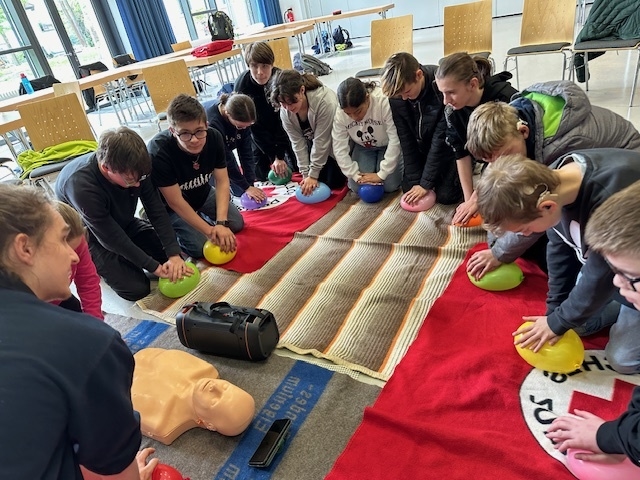 Am 8. Mai besuchte uns unser Ausbilder Mattis Bohne vom Jugendrotkreuz noch einmal, um mit uns einen weiteren wichtigen Teil der Ersten Hilfe zu üben: die Herz-Lungen-Wiederbelebung (HLW). Hier lernten wir die richtige Technik, um bei einem Herzstillstand effektiv helfen zu können. Wir übten die Wiederbelebung an Puppen. Das war ganz schön anstrengend.