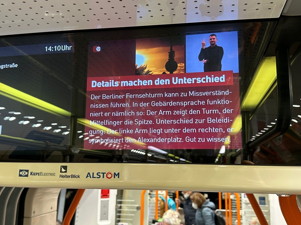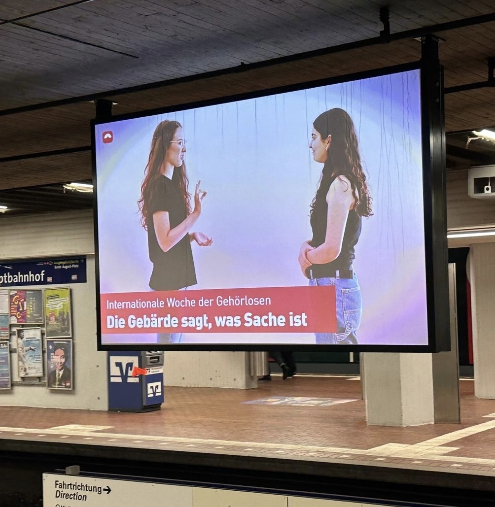 Am 23.September fand wieder einmal der internationale Tag der Gebärdensprache statt. Zu diesem Anlass hat sich die ÜSTRA Hannoversche Verkehrsbetriebe etwas ganz Besonderes überlegt. Im Fahrgastfernsehen der U-Bahnen und Busse der Üstra und auch an den Videotafeln der Bahnhaltestellen in Hannover sind seit dem 23.09.2022 Videos, Informationen und Fragen zum Thema Gehörlosigkeit eingeblendet. Bis Ende diesen Jahres werden die Filme gezeigt. Die Filme wurden in Kooperation mit dem Gehörlosenverband Niedersachsen e.V. gedreht. Sogar zwei Schülerinnen vom LBZH BS, Susann Pollehn und Zara Rajabpour, waren bei den Vorbereitungen mit dabei. Es war aufregend und hat viel Spaß gemacht.
