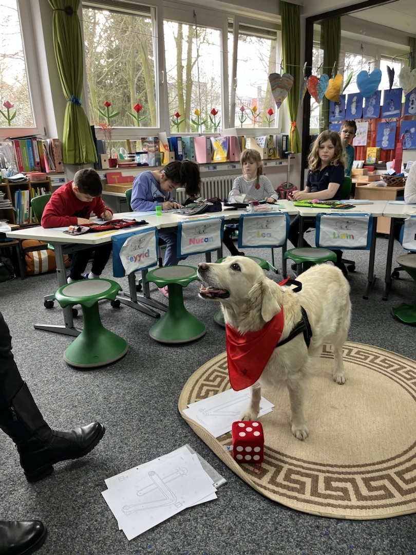 Einmal in der Woche besucht sie die Eingangsklassen und wird hauptsächlich in der E1 als Klassenhund eingesetzt. Im Mensch-Hund-Team wurden Frau Zense und ihre Hündin für den Einsatz in der Schule ausgebildet. Die erste Aufregung der Schüler*innen nimmt Skylar gelassen hin. Sie schläft gerne im Klassenraum auf ihrem Teppich und freut sich über Interaktionen mit den Kindern (Würfeln der Aufgaben, Kommandos, Suchspiele). Aufgabenhefte lässt sie sich gerne zeigen.