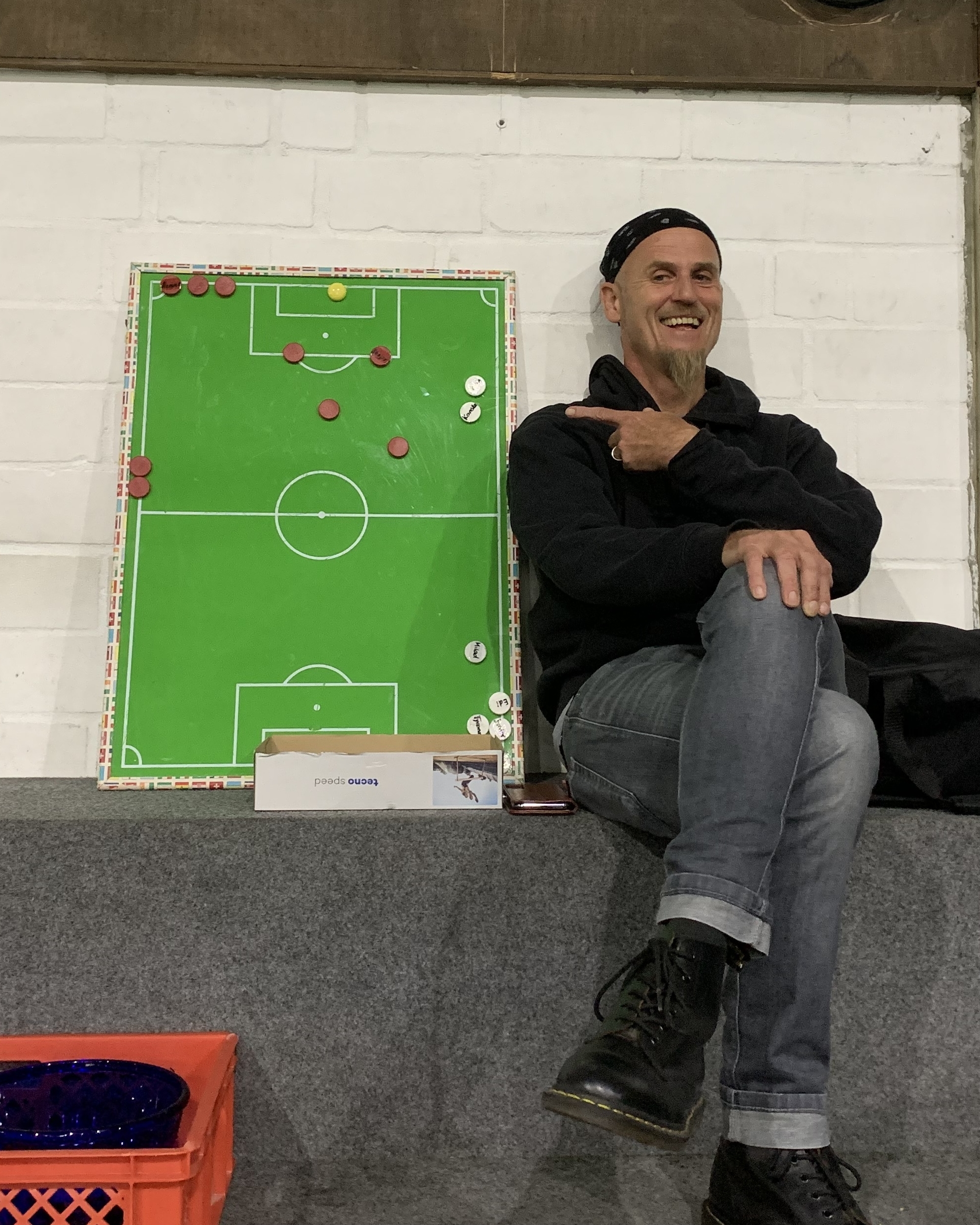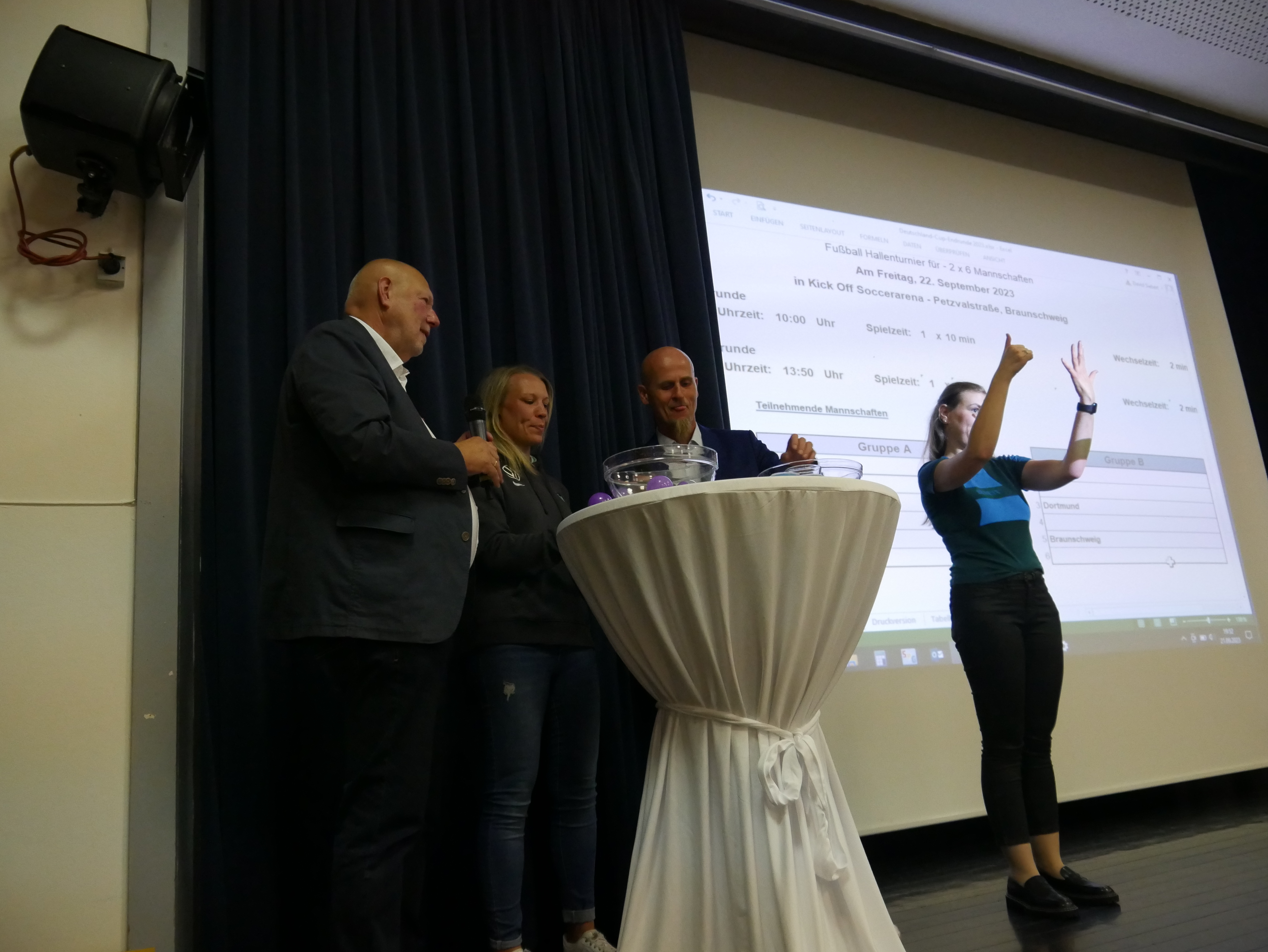 Danach erfolgte die lang ersehnte Gruppenauslosung für den nächsten Tag, den Finaltag: Unter der Regie von Peter Fiebiger, dem Geschäftsführer des Gehörlosensportvereines Braunschweig, zogen die 3 Bühnengäste die Teams aus den Auslosungstöpfen, für die Schülerinnen und Schüler immer das abschließende Highlight der Eröffnungsveranstaltung.
