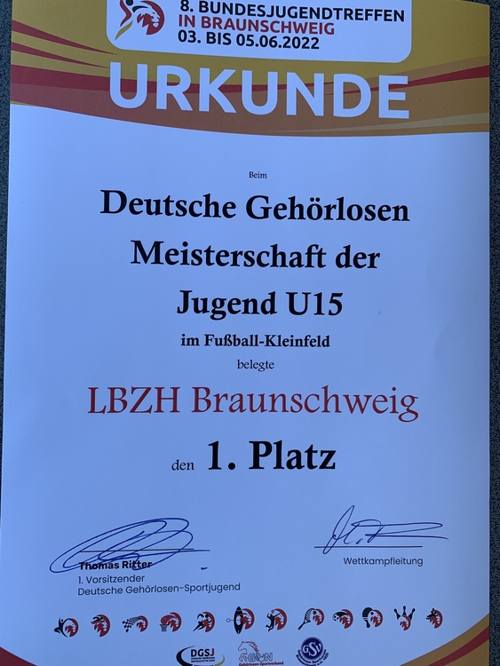 Die U15 Fußballmannschaft des LBZH Braunschweig ist neuer Deutscher Meister der Gehörlosen. Neuer Deutscher Fußball-Meister sind somit Niklas Polen, Edi Racolta, Levin Wolf, Christian Helmerding, Isa Ylmaz, Aleksej Carcanji, Mikail Bechev, Abdullah Sammour, Mosihn Naseri und Milad Rezaee, der zugleich auch Torschützenkönig des Turniers wurde.