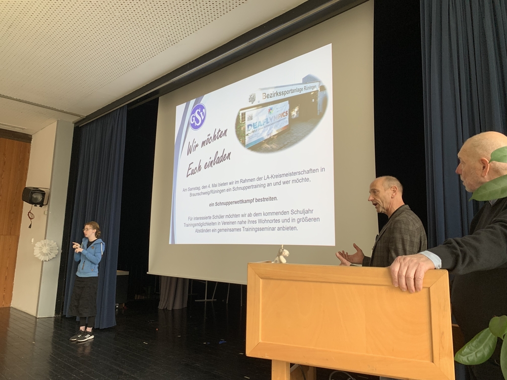 Aktueller Anlass war die Vorstellung der neuen Leichtathletik-Abteilung. Für unsere Schülerinnen und Schüler sind weiterhin kostenlose Vereinsmitgliedschaften möglich. Zudem wird am Samstag, den 04. Mai im Rahmen der LA-Kreismeisterschaften in Braunschweig/Rüningen ein Schnuppertraining bzw-Wettkampf angeboten. Weiterhin sollen für interessierte Schülerinnen und Schüler ab dem kommenden Schuljahr Trainingsmöglichkeiten in Vereinen nahe ihres Wohnortes und in größeren Abständen ein gemeinsames Trainingsseminar angeboten werden. Viele Kinder und Jugendliche haben an der sehr anschaulichen Vorstellung, mit Präsentation und Gebärdendolmetscherin, teilgenommen.