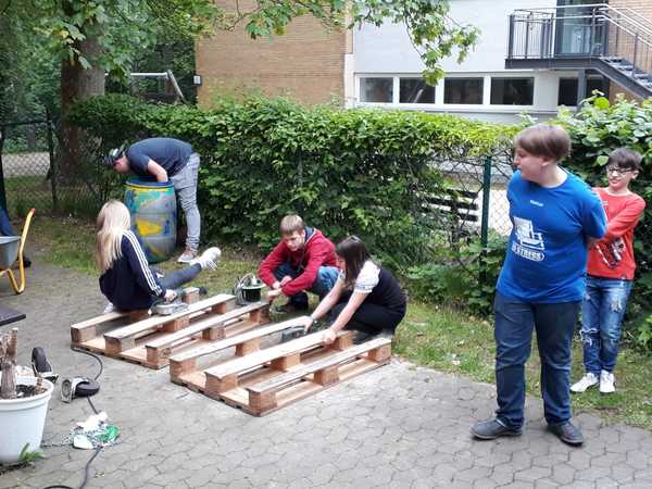 Im Sommer befasste sich das Internat im Rahmen von Upcycling – das Umwandeln von alten, nutzlosen Rohstoffen in neue Produkte – mit alten Holzpaletten, da die Jugen beim Bauen ihrer Holzplatten viel Freude hatten. Schnell war eine Idee für eine neue Verwendung der Holzpaletten gefunden. Mobile Hochbeete sollten aus den Europaletten entstehen. Die Kinder und Jugendlichen aus Haus 2 waren sofort Feuer und Flamme und nahmen die alten Paletten auseinander, so dass sie nur noch das Grundgerüst hatten. Die jüngeren Kinder aus dem Internatshaus 1 schauten den Jungen dabei neugierig zu und durften dann unter Anleitung der älteren Jungs ebenfalls mithelfen. Dadurch entstand ein hausübergreifendes Projekt und schnell waren alle Kinder und Jugendlichen des gesamten Internats in das „Upcyclen“ der Holzpaletten involviert.