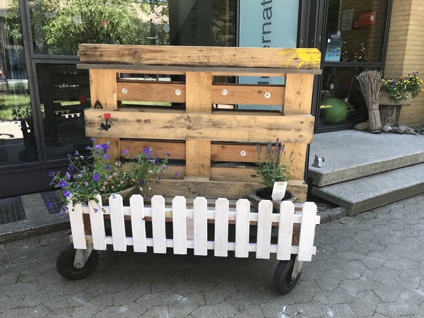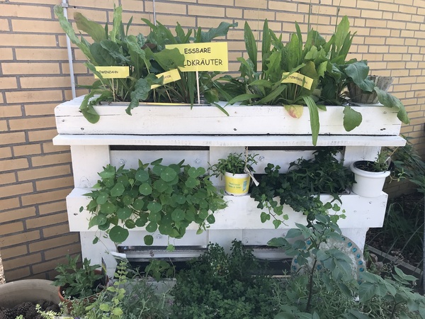 Die Paletten wurden neu zusammengeschraubt und wurden auf Rollen gesetzt, damit man die Beete entsprechend des Sonnenstandes verschieben kann. Blumen und Kräuter zum Bepflanzen wurden gekauft und von den Kindern eingepflanzt. Zum Abschluss bemalten die Kinder ihre Hochbeete und warten jetzt gespannt darauf, die ersten Kräuter zu ernten, um diese für Kochrezepte weiter zu verwenden.